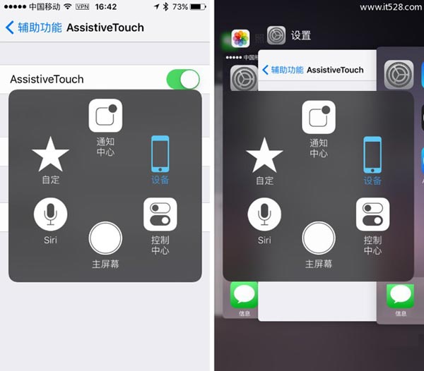 增加‘多任务’‘屏幕快照’两个常用功能,非 iPhone 6s 和 iPhone 6s Plus 的用户建议增添‘静音’。