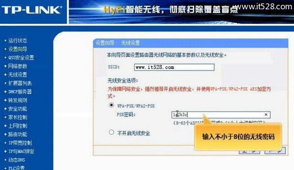 5、接下来是无线设置,这里SSID是填写wifi网络名称,也就是手机搜索的时候能够看到的无线网络名称,可以任意填写,自己喜欢就好,比如小编这里设置成了悟途网网址:www.it528.com。然后下面6需要填写PSK密码,这个就是Wifi密码,建议尽量复杂一些,防止被他人蹭网,完成后点击底部的“下一步”,如下图所示。