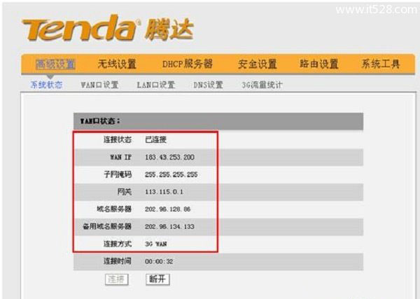 2、进入腾达3G150B的设置界面后,如果查看到“连接状态”显示为:已连接;说明无需其他设置了,腾达3G150B已经实现了3G上网卡上网。