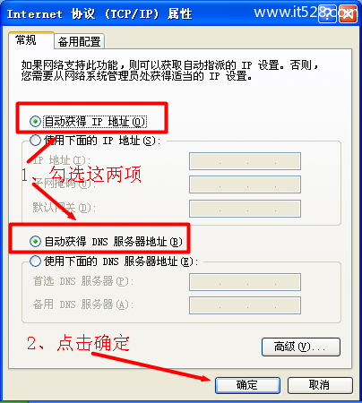4、选择“自动获得IP地址”,“自动获得DNS服务器地址”“确定” 。