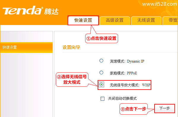 3、点击“快速设置”进入上网模式选择,新版本的腾达A32迷你无线路由器提供了:“宾馆模式:Dynmic IP”、“家用模式:PPPoE”、“无线信号放大模式:WISP”这3中上网类型,下面详细介绍如何选择模式。