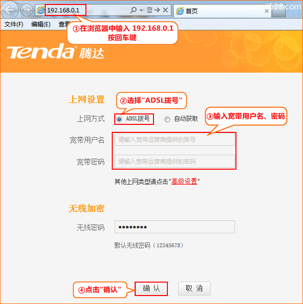 1、在浏览器中输入:192.168.0.1 按回车键——>在跳转的页面中输入密码“admin”——>点击“确定”。(如果192.168.0.1打不开,请搜索本站文章:腾达(Tenda)无线路由器192.168.0.1 打不开的解决办法)