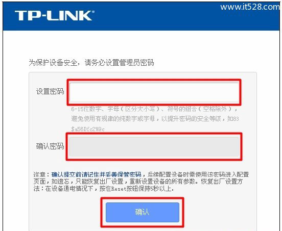 1、登录管理界面:打开网页浏览器,在浏览器的地址栏中输入:tplogin.cn并按下回车——>设置管理员的登录密码——>点击“确认”。(请牢记自己设置的管理员登录密码,一旦忘记登录密码,只能通过恢复出厂设置的方法来重新配置)(tplogin.cn打不开?请搜索本站文章:tplogin.cn打不开的解决办法)