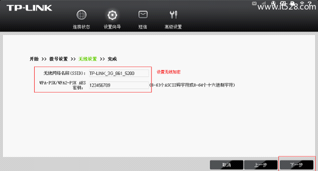 (5)、建议修改“SSID”并设置“WPA-PSK AES密钥”——>“下一步”。注意:SSID名称只能使用数字、字母的组合,不支持中文汉字。