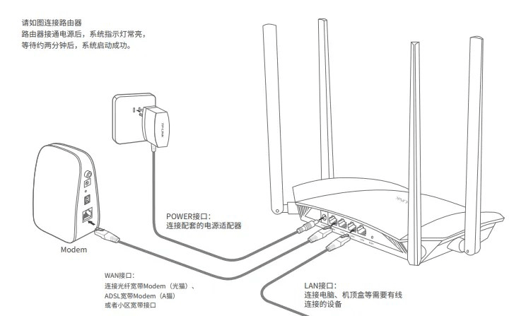 3.检查tplink路由器上的网线接口连接是否正确。tplink路由器、光猫/宽带网线、电脑 之间的连接方式如下: