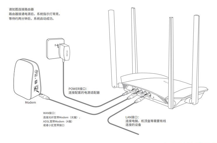 1.把你的腾达路由器接通电源,然后按照下面的方式,把它与光猫(宽带网线)连接起来。